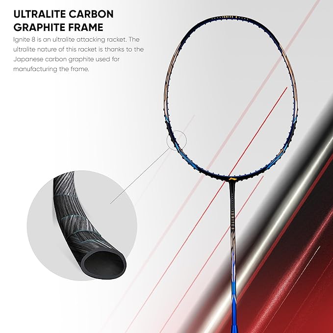 • Ultralite Carbon Graphite Frame: Ignite 8 is an ultralite attacking racket. The ultralite nature of this racket is thanks to the Japanese carbon graphite used for manufacturing the frame.